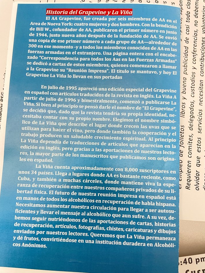 La comunidad hispana de AA en los Estados Unidos y Canadá y en otros países de habla hispana ha crecido de manera considerable en las últimas décadas. Si bien varios boletines y revistas locales, algunos de ellos inspirados en el Grapevine, han aparecido en países de habla hispana a lo largo de los años, están dirigidos usualmente a su comunidad local y tienen una distribución limitada en otros lugares. Además, numerosos miembros de habla hispana de AA querían desde hace tiempo poder leer y enviar artículos al Grapevine en su propio idioma. Esta necesidad expresada se llevó a la Conferencia de Servicios Generales en 1991 y se emitió una recomendación para que el Grapevine comience a publicar al menos un artículo en español cada mes. Estos artículos aparecieron regularmente entre septiembre de 1991 hasta junio de 1996.